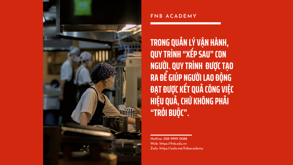 Trong quản trị vận hành F&B, quy trình “xếp sau” con người, và hoạt động vận hành cần ưu tiên đạt mục tiêu kinh doanh. Quy trình không được tạo ra để “trói buộc” người lao động, mà nhằm mục đích giúp họ đạt được kết quả tốt hơn.