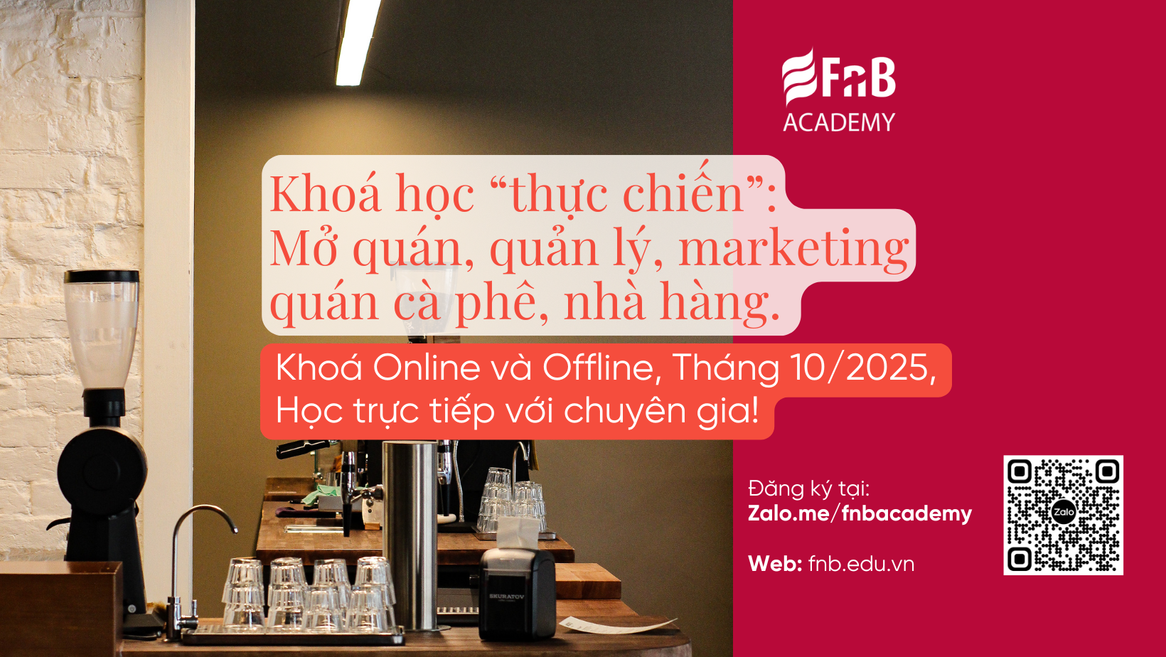 FnB Academy tiếp tục hành trình cung cấp kiến thức kinh doanh F&B chuẩn xác và thực tiễn đến với các chủ quán, nhân sự quản lý, nhân sự chuyên môn của quán cà phê, nhà hàng. Giúp các bạn đầu tư mở quán cà phê, mở nhà hàng hiệu quả, và phát triển nghề nghiệp trong ngành F&B.